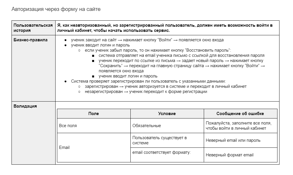 Внутри пользовательских историй мы размещаем бизнес-правила или UseCases. Это перечень условий, при котором фича будет работать так, как нужно клиенту.